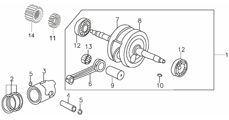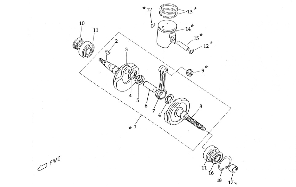 Коленчатый вал, поршни и шатуны 2-Х ТАКТНОГО ПЛМ MERCURY 50EO Серийный номер от 0T980000 до 0T999999